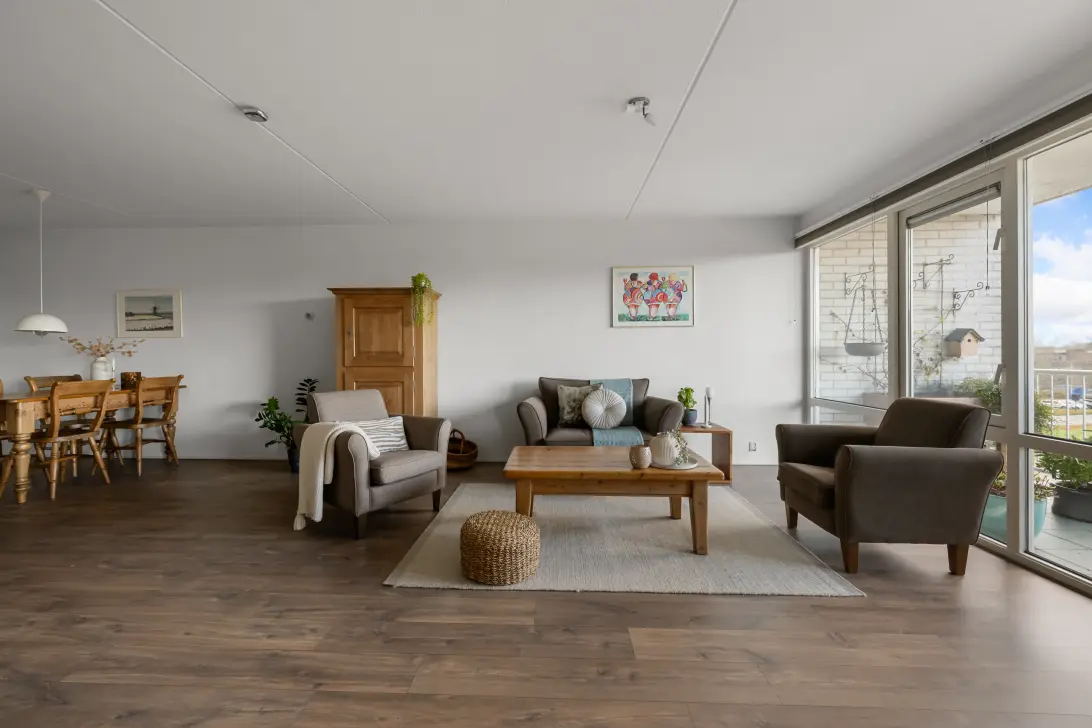 De rechthoekige vorm maakt de woonkamer goed in te delen met een gezellige zithoek én een royale eettafel.
