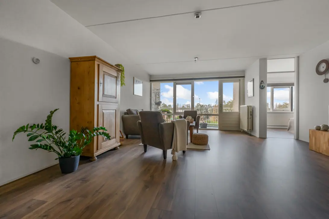 Je komt binnen in een ruime hal die toegang geeft tot de woonkamer. De woonkamer is verrassend licht dankzij de brede raampartij aan de waterzijde. Vanuit je zit- en eethoek kijk je uit over het groen en het water voor het gebouw – een heerlijk rustig, weids uitzicht.