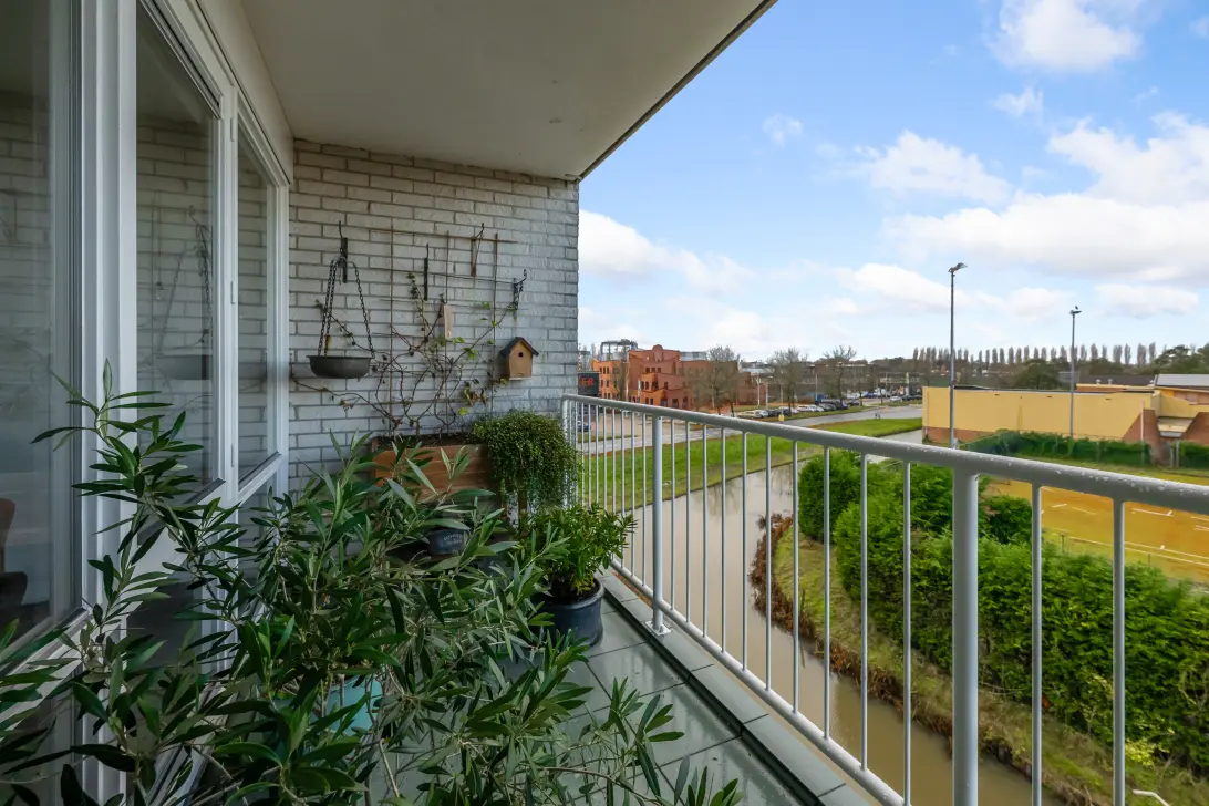 Via de woonkamer stap je zo het balkon op. Hier kun je met gemak een tafeltje en twee stoelen kwijt. De houten plantenbak aan de linkerzijde blijft achter; ideaal om wat kleur toe te voegen met bloemen of kruiden.
