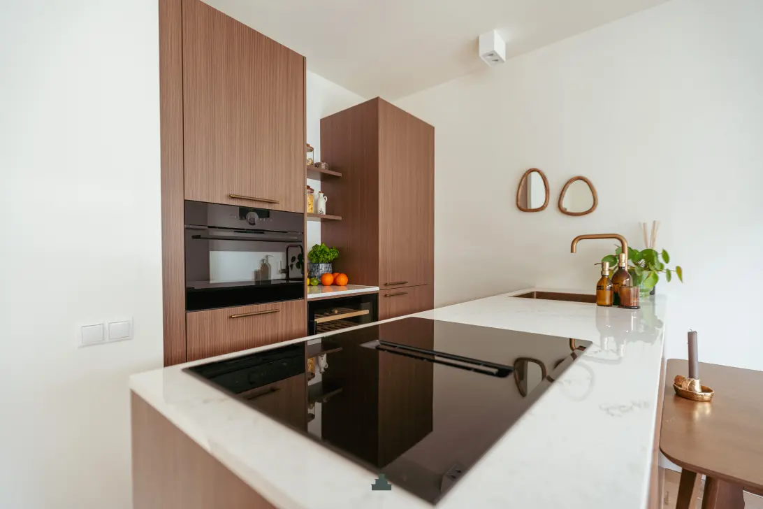 The kitchen itself is both functional and stylish: wooden cabinet fronts, a copper sink and tap, and copper-toned handles lend a warm, sophisticated touch. The design is consistent with the rest of the interior, creating harmony throughout. Appliances include an induction hob with integrated extractor, combi-oven, dishwasher, fridge, freezer, and wine fridge.