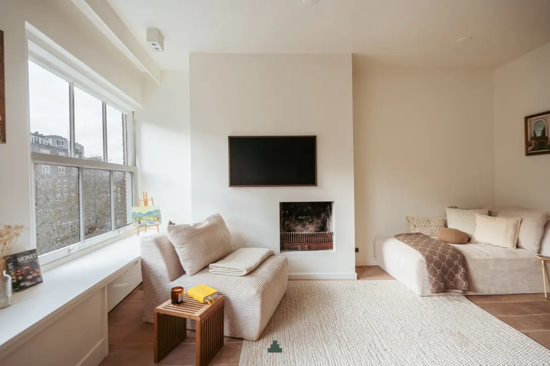 The living room is beautifully bright, thanks to large windows with classic divided panes that enhance the intimate and inviting atmosphere. The canal view takes centre stage, while the fireplace adds charm and cosiness.