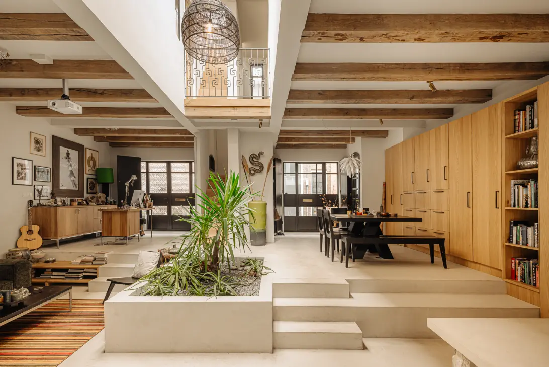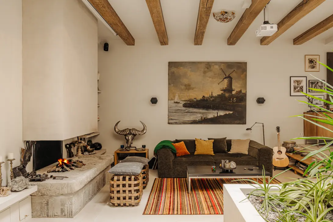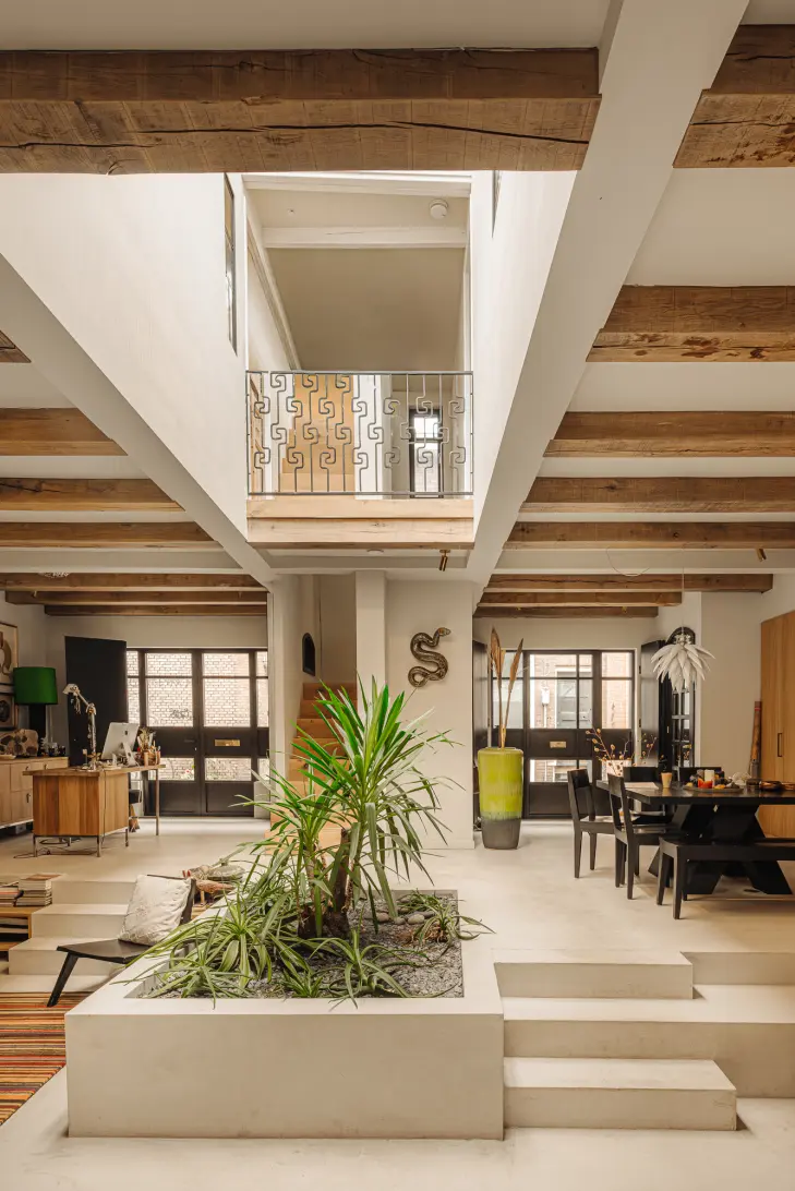 De open haard en het keukeneiland zijn vervaardigd uit monumentale bouwmaterialen van Jan van Eiken, net als de indrukwekkende eiken balken die de woning karakter geven. Dankzij de diverse ramen én dakramen geniet je hier de hele dag van overvloedig daglicht.