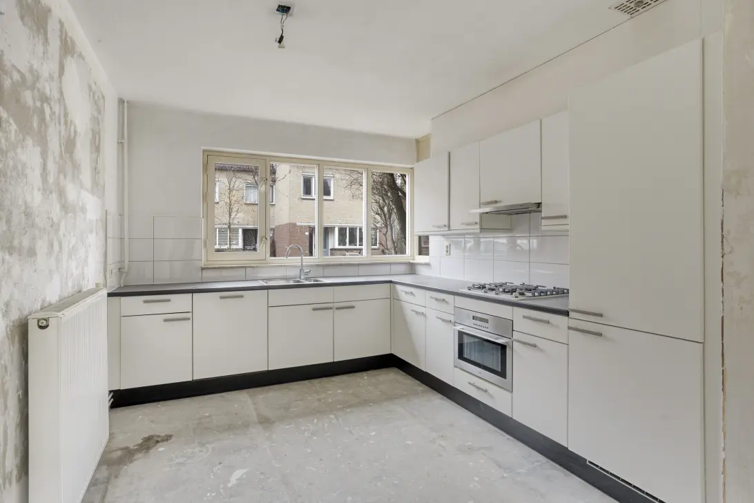You enter the home from the street side. The hallway gives access to the toilet, the stairs to the first floor, and the living room. The living room forms the heart of the ground floor and is wonderfully bright thanks to the open layout and large windows. There is ample space for a comfortable seating area and a generous dining area. Through the sliding door, you have direct access to the backyard. At the front of the house is the open kitchen with an L-shaped countertop, equipped with a gas stove, sink, built-in oven combination, refrigerator, dishwasher, and plenty of storage space. The kitchen provides a solid base and can be fully modernized to your own taste.