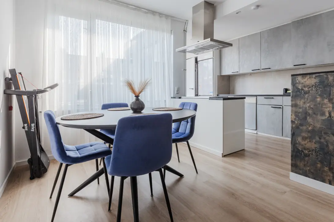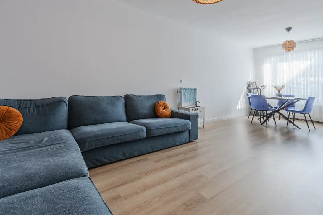 De ruime doorzonwoonkamer geniet van een grote hoeveelheid lichtinval en is strak afgewerkt met een laminaatvloer en strakke muren en plafonds in een neutrale kleurstelling.