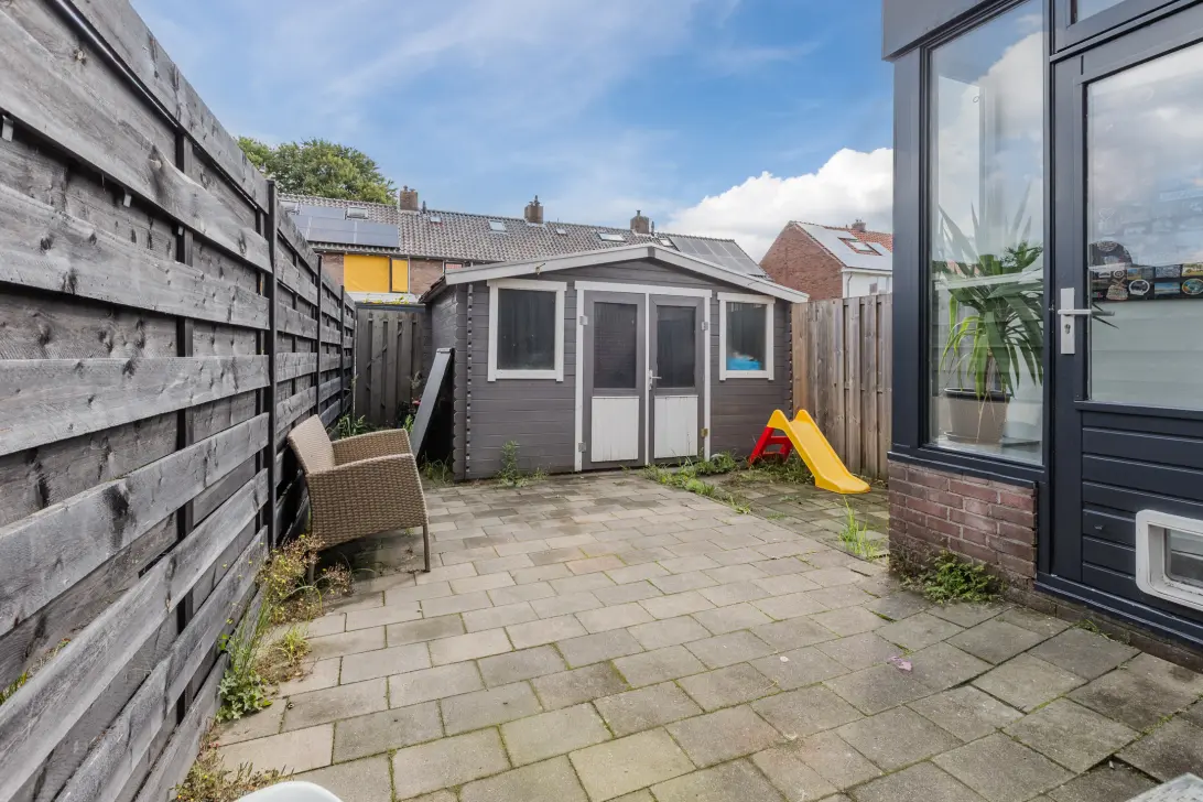 De onderhoudsvriendelijk tuin op het noordoosten beschikt over een handige houten berging welke voorzien is van elektriciteit. Een ideale plek voor het stallen van je (elektrische) fiets nadat je de tuin via de achterom bent binnengekomen.