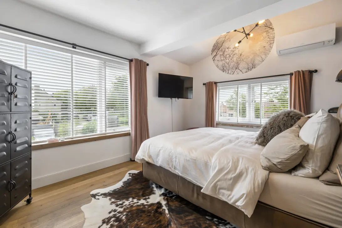 Tweede verdieping: een royale derde slaapkamer met veel bergruimte achter de knieschotten en een airco.
