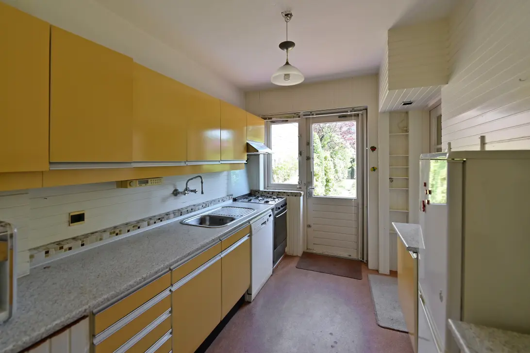 - Dichte eenvoudige keuken met deur naar tuin en deur naar woonkamer.