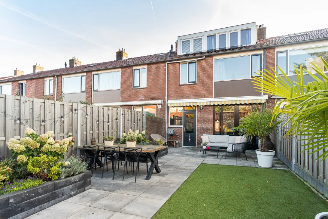 - De diepe achtertuin ligt op het zuidoosten, heeft een stenen berging en een achterom.