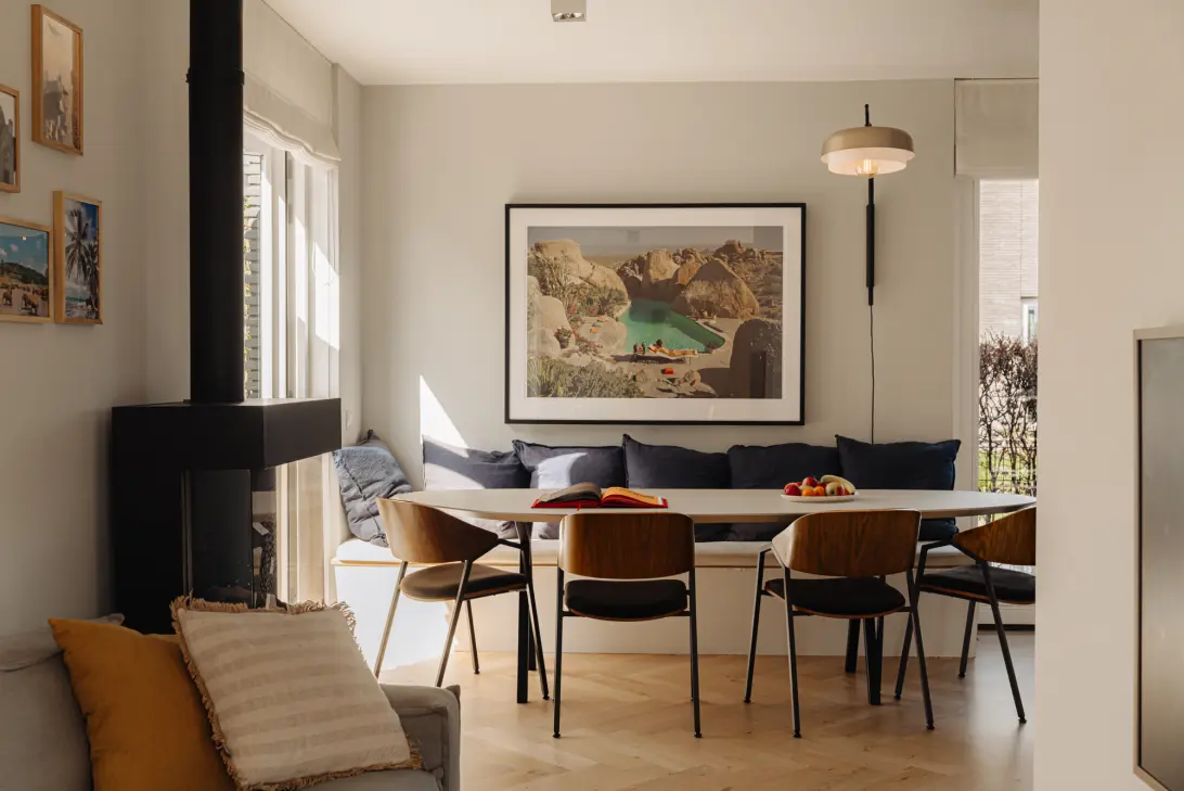 Aan de rechterkant van de woning ligt de keuken, modern opgezet met een kookeiland, en een (stoom) oven, combi oven-magnetron, quooker, wijnklimaatkast, ruime koelkast, en ruime vriezer, inductiekookplaat met downdraft afzuiging en vaatwasser. Dit is een fijne plek om te koken terwijl je in contact blijft met de rest van het huis. De keuken met bar loopt naadloos over in de eetkamer, waar ruimte is voor een grote eettafel om met familie of vrienden samen te komen met een sfeervolle gaskachel. Ook vanuit deze ruimtes heb je toegang tot buiten, wat het binnen-buiten gevoel versterkt.