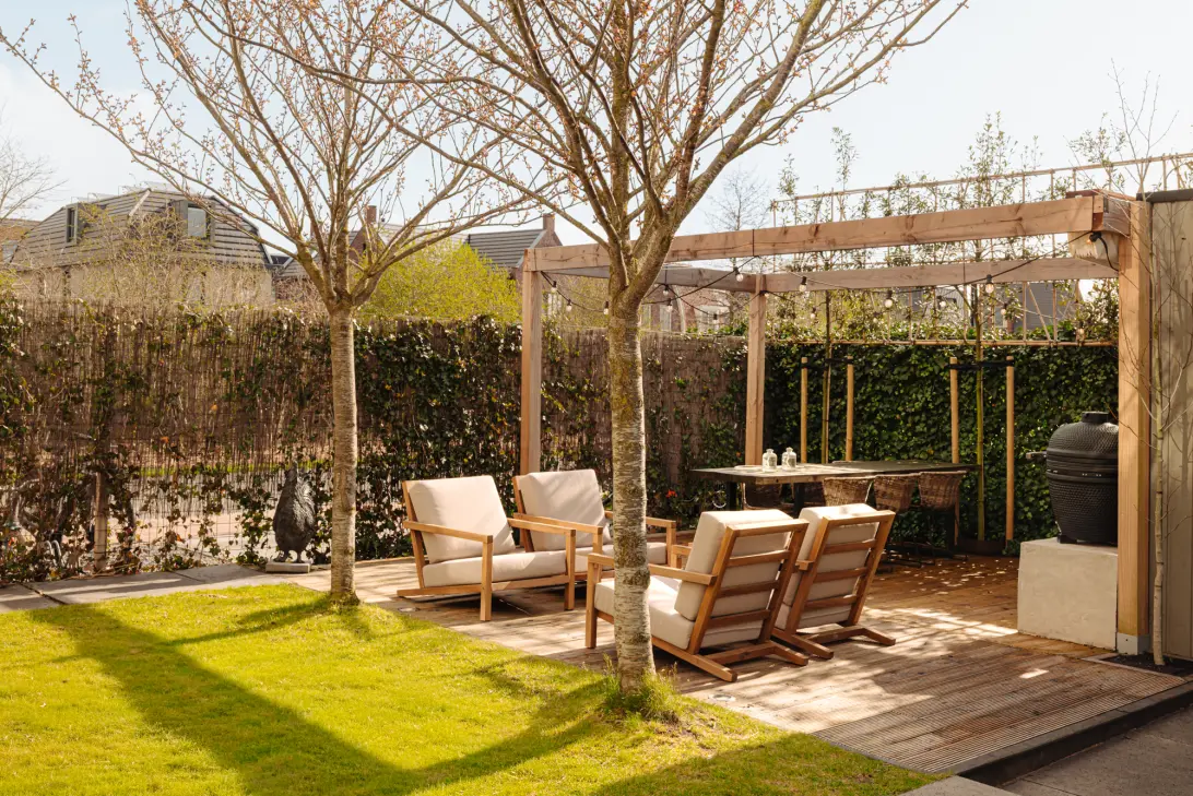 De tuin is royaal en speels ingedeeld met verschillende zones. Er zijn meerdere terrassen waar je kunt zitten, een groen gazon in het midden en zelfs ruimte voor bijvoorbeeld een trampoline. Achterin vind je een gezellige loungehoek, terwijl er elders nog een tweede zitplek is. Aan de zijkant van het perceel bevinden zich een praktische berging en een parkeerplaats op eigen terrein, met daarnaast nog een derde terras met buitenkeuken.