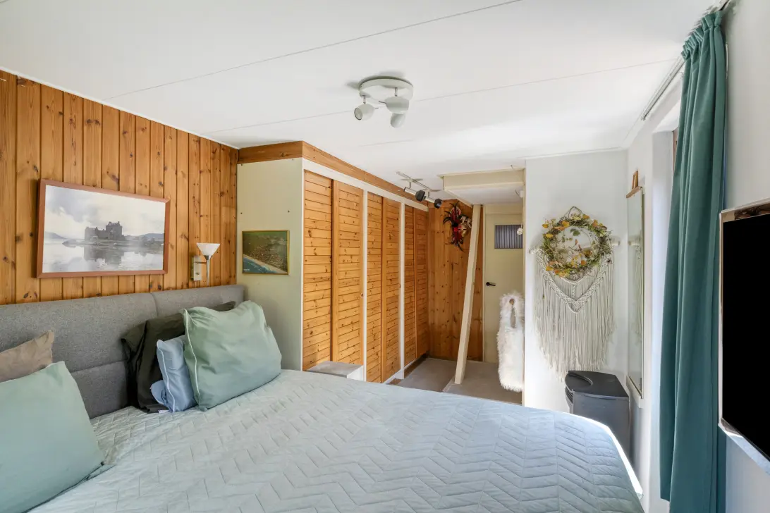 De badkamer is eenvoudig uitgevoerd en voorzien van een douche en wastafel. Via de overloop is ook een kleine vliering bereikbaar voor extra bergruimte. Het dak van de woning is deels vernieuwd, wat al een mooie basis biedt voor verdere modernisering.