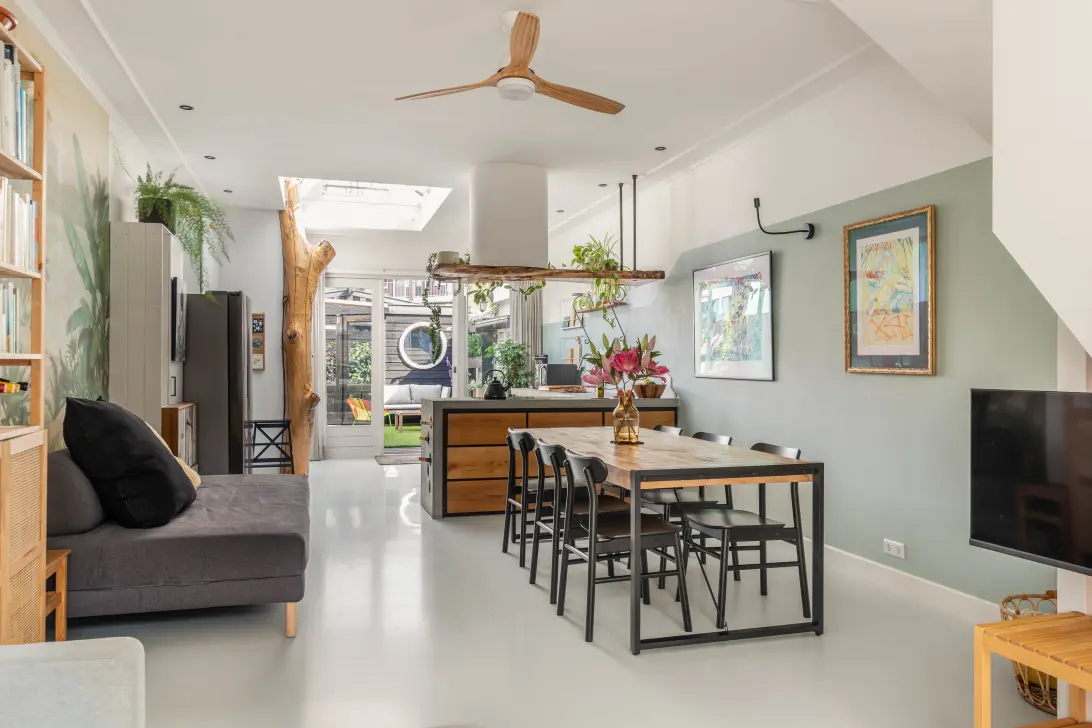 Entree. De woonkamer op de begane grond is uitgebouwd en v.v. van een dakraam, waardoor er een royale lichte leefruimte is ontstaan met open keuken.