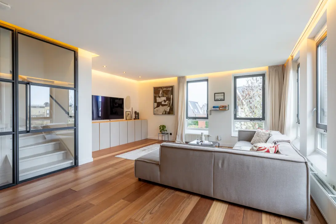 Er zijn namelijk veel ramen, welke ook nog eens geweldig uitzicht geven op de wijk. Een echte eye-catcher is de grote stalen pui voor de trappen. De woonkamer is afgewerkt met een Jatoba hardhouten vloer en de wanden en het plafond zijn strak gestuukt. Overigens zijn alle wanden en plafonds in het huis gestuukt.