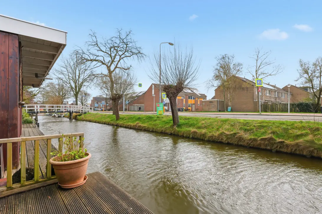 Buiten maakt deze woning het plaatje compleet. De achtertuin is verzorgd aangelegd en een fijne plek om te genieten van rust en privacy met een ligging aan vaarwater die je niet vaak tegenkomt. Juist die combinatie van een unieke ligging, een opvallend nette staat van onderhoud en de mogelijkheid om alles naar eigen smaak te vernieuwen, maakt dit een bijzonder aantrekkelijk huis voor kopers die potentie herkennen en waarderen.