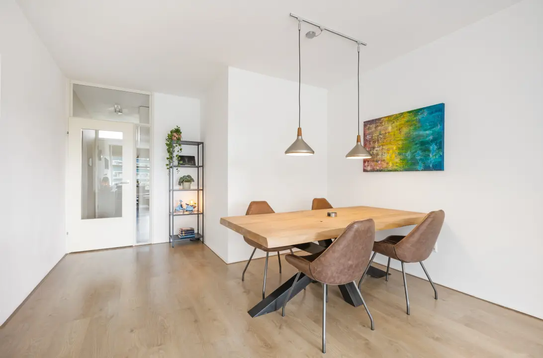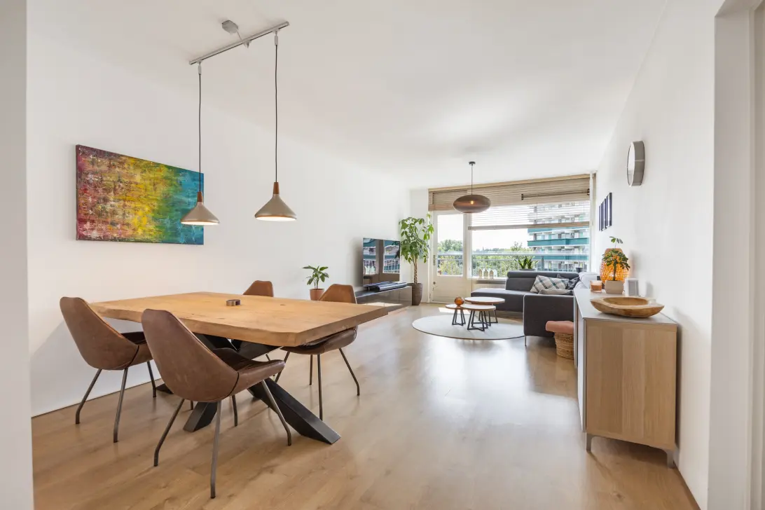 The living room is located at the rear and measures over 7 meters in depth, offering ample space for both dining and living areas. Thanks to the favorable orientation, the living room is wonderfully light and finished with a sleek laminate floor and smooth plastered walls. From here, a single door opens onto the spacious south-facing balcony with unobstructed views over the urban yet green surroundings of Amsterdam-Noord.