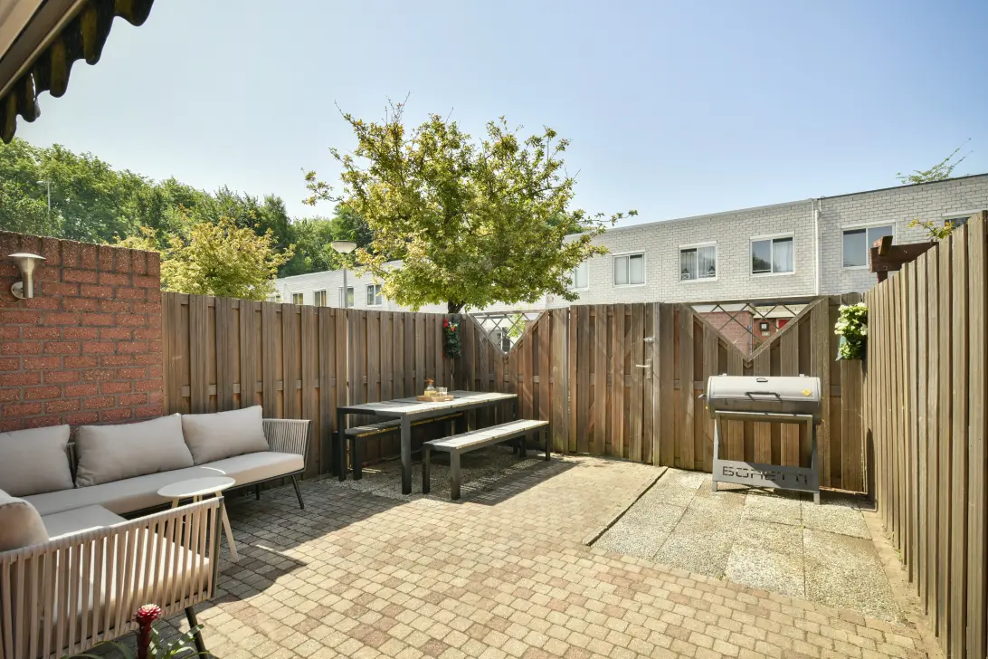 The entrance is reached through the private front garden, which offers ample space for parking bicycles or adding a nice bench. Upon entering, you'll find a wardrobe, toilet, and meter cupboard. The hallway leads to the living room with its garden-facing location. At the front is the spacious, white kitchen, which also houses the dryer. The modern semi-open kitchen is equipped with built-in appliances, a 5-burner induction cooktop, oven, microwave, refrigerator, freezer, and dishwasher. There is ample storage space. The dining room overlooks the charming front garden.