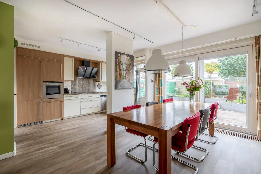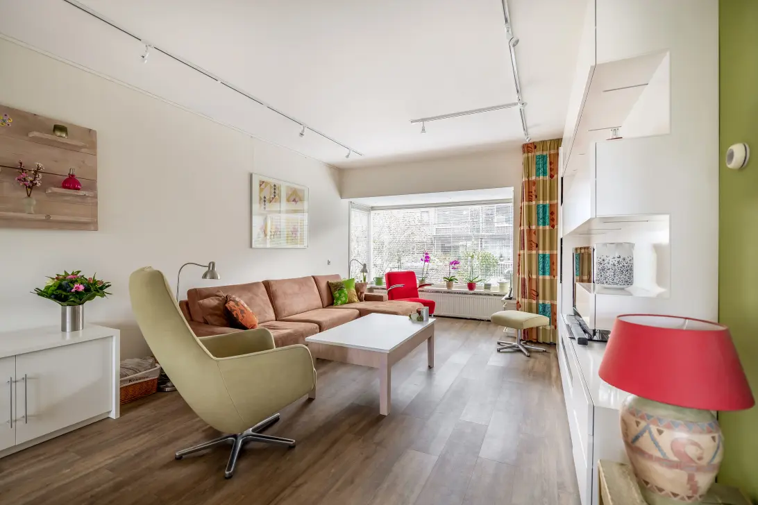 De woonkamer strekt zich uit over de volledige lengte van de woning en geniet door de grote raampartijen, aan zowel de voor- als achterzijde, van een prettige hoeveelheid lichtinval.