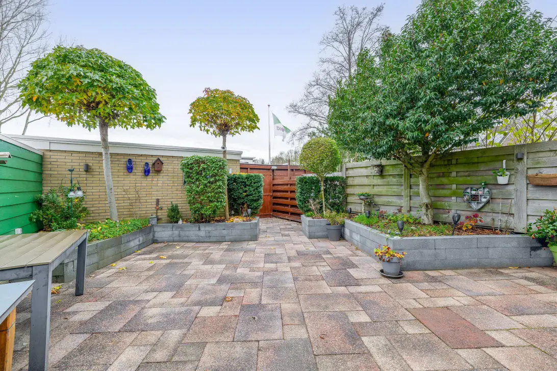 De woning beschikt over een royale achtertuin van ca 72 m2 gelegen op het westen. De tuin is keurig onderhouden en biedt volop ruimte voor ontspanning. Er is een stenen schuur met elektriciteit voor extra opbergruimte en de tuin is ook toegankelijk via een achterom.