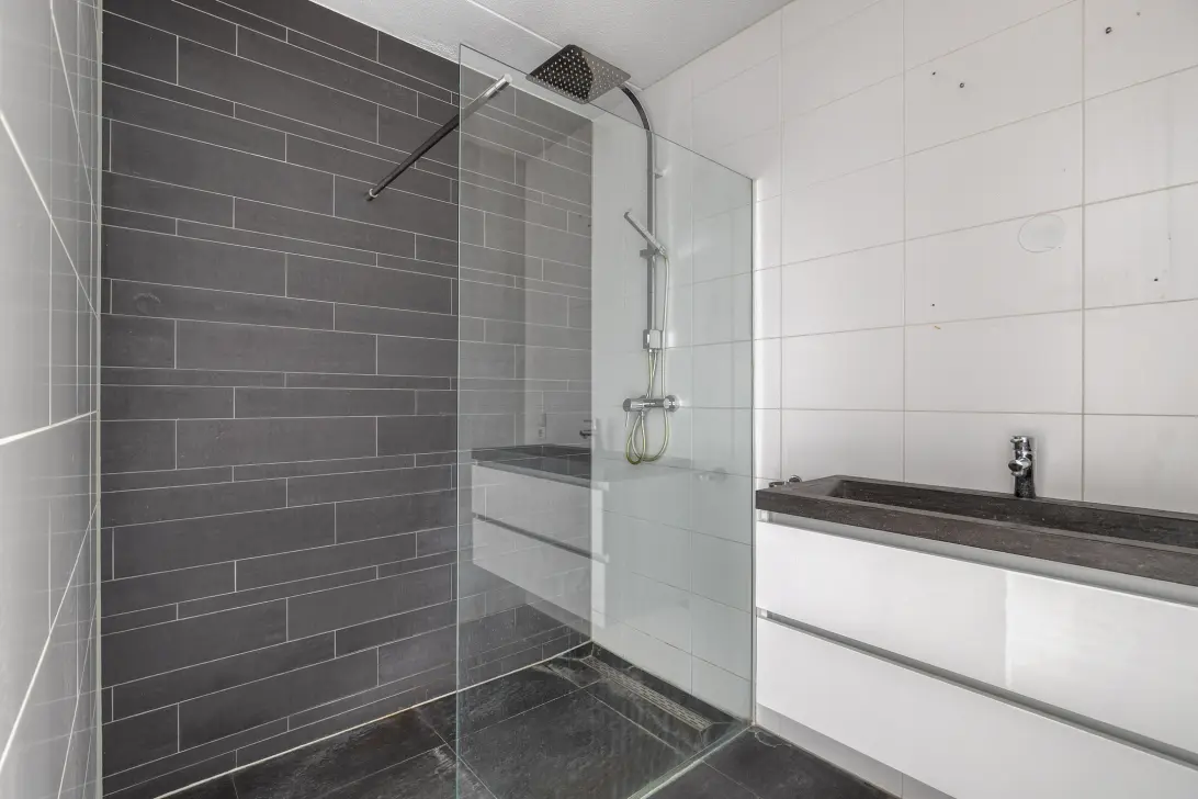 Voor de dagelijkse verzorging is er een nette, volledig betegelde badkamer voorzien van een ruime douche en een stijlvol wastafelmeubel. Daarnaast is er een apart toilet met een fonteintje in de hal, zodat alles praktisch geregeld is. Het appartement beschikt bovendien over een functionele wasruimte met wasmachineaansluiting.