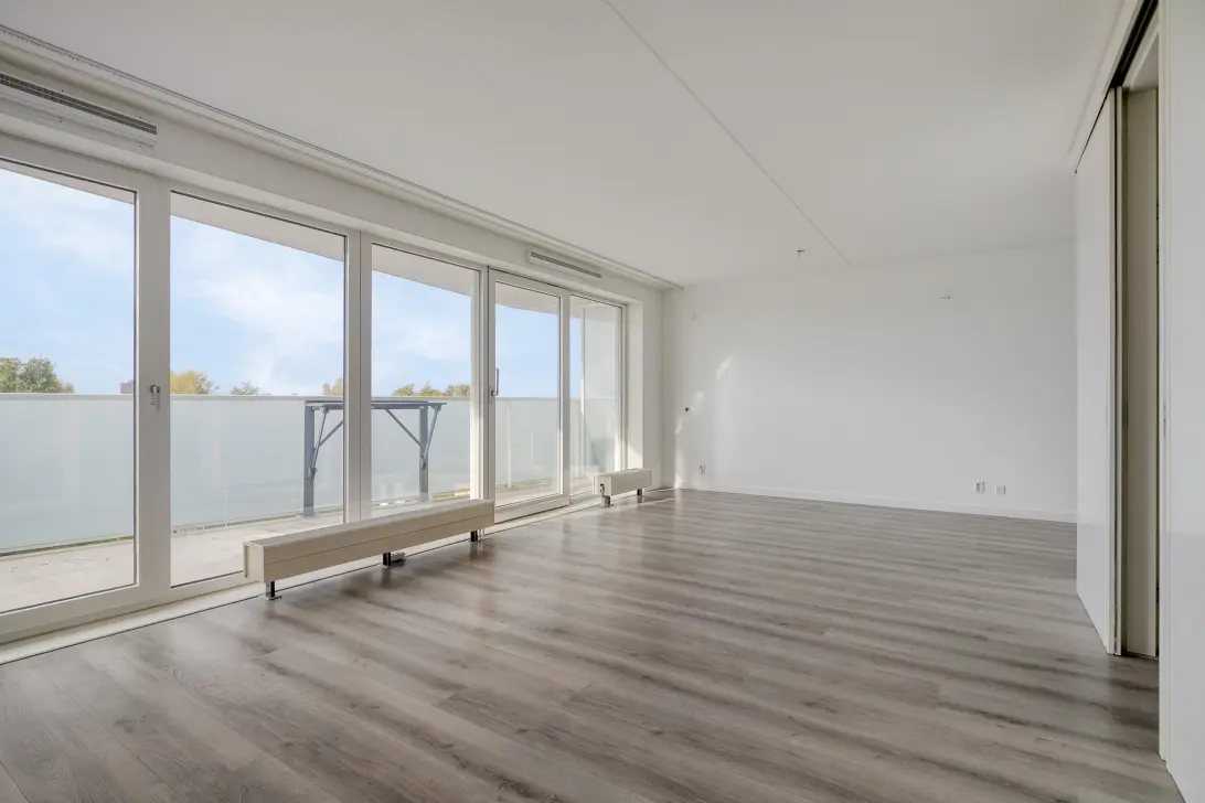 De woonkamer is doordrenkt met natuurlijk licht door de grote raampartijen. Hierdoor ontstaat er een uitnodigende sfeer die uitermate geschikt is om te ontspannen na een drukke dag. Ben je in de stemming voor een gezellige avond met vrienden of familie? De woonkamer biedt genoeg ruimte voor zowel een comfortabele zithoek als een praktische eetplek. Bovendien leidt een ruime deuropening je naar een zonnig balkon, waar je in alle rust kunt genieten van de buitenlucht en de zonnestralen.
