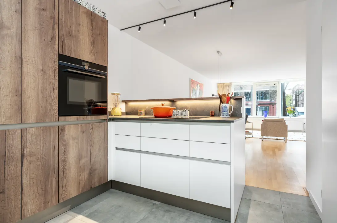 Via de hal heeft u toegang tot alle vertrekken op de begane grond. De luxe open keuken bevindt zich aan de achterzijde uitkijkend over de binnenplaats en is voorzien van Miele oven, inductie kookplaat, koelvries combinatie, Quooker kraan en een leuk barretje om aan te borrelen.