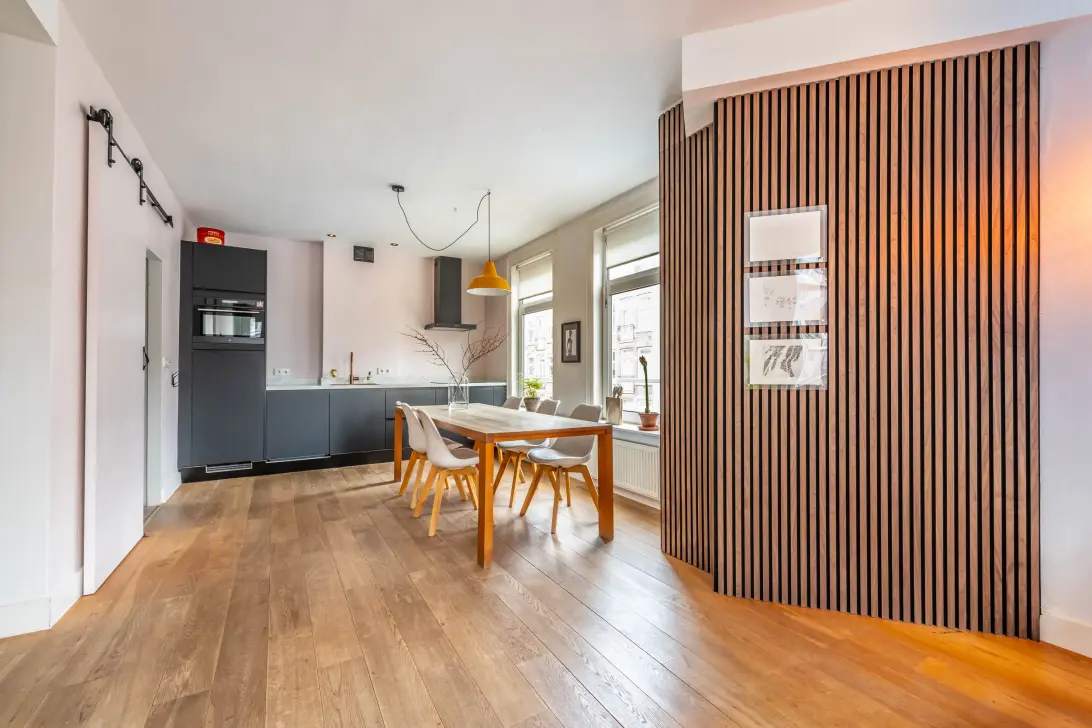 Aan de voorzijde van de woning bevindt zich de woonkamer met open keuken. Door de grote raamkozijnen en de hoekligging is de ruimte als zeer licht te omschrijven. Aansluitend aan de woonkamer is een Frans balkon gelegen op het Oosten.