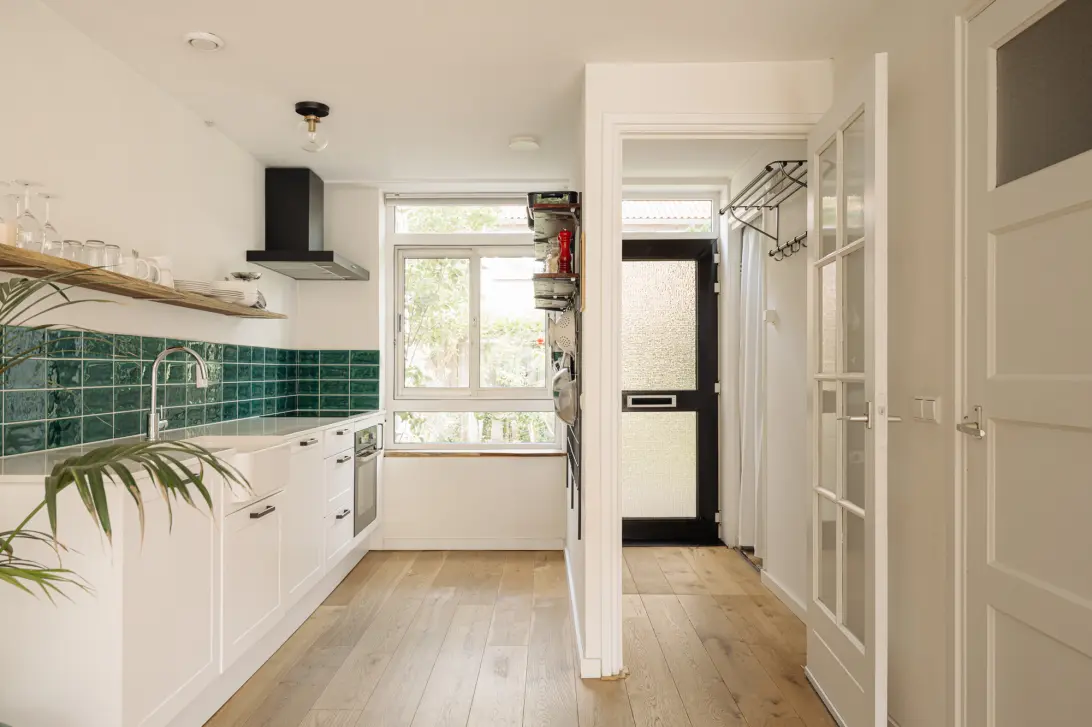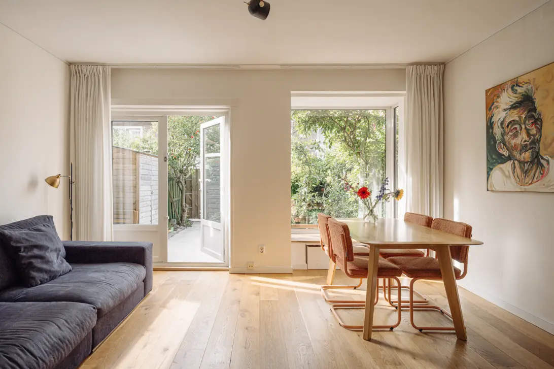 Very centrally located, sunny home with beautiful natural light and a lovely garden. Situated on a green side street, you’ll find this mostly renovated family home with three bedrooms. This charming property offers a living space of 73 m² plus a 7 m² storage room and a sunny, well-maintained west-facing backyard (approx. 34 m²) with rear access. By adding a fixed staircase and two dormer windows, the attic can be extended quite easily. There is also the possibility to extend the ground floor, potentially adding around 15 m² of extra living space! What could be better than spending a sunny day outdoors, relaxing, barbecuing, or gardening? It’s all possible in this child-friendly neighborhood! The ground lease has been bought off in perpetuity (!) so you won’t have any recurring annual payments.