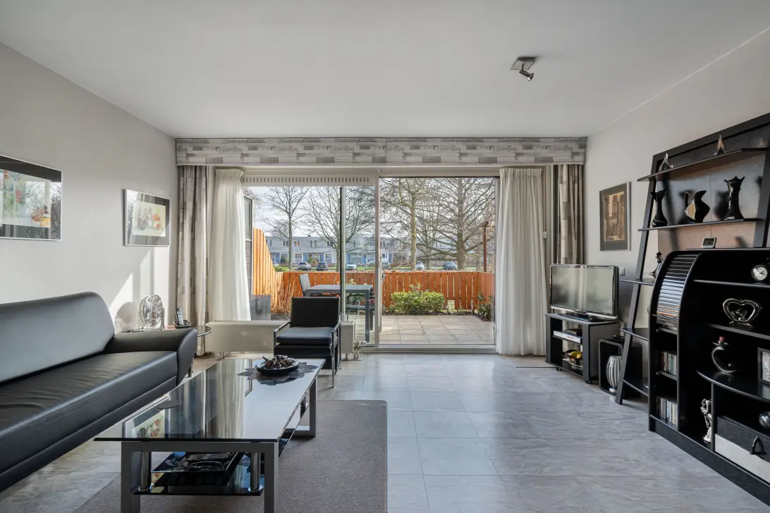 Aan de achterzijde van de woning ligt de ruime en lichte woonkamer. De grote schuifpui zorgt voor een mooie lichtinval en een directe verbinding met buiten. Vanuit de woonkamer kijkt u uit over de tuin, het water en het groen van het Muzenpark – een uitzicht dat elk seizoen weer anders en bijzonder is. De gehele begane grond is afgewerkt met een nette laminaatvloer, wat zorgt voor een rustige en verzorgde uitstraling.