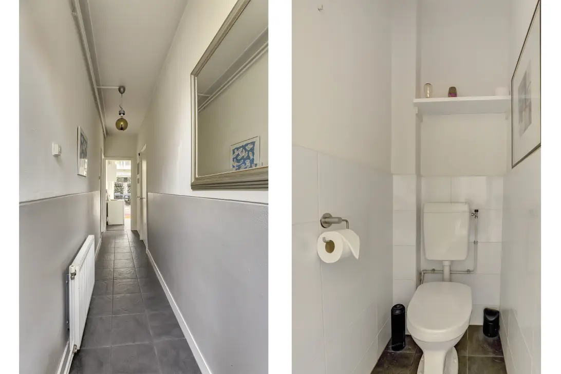 Begane grond: entree/hal met kelderkast, toilet en toegang tot de keuken en woonkamer.