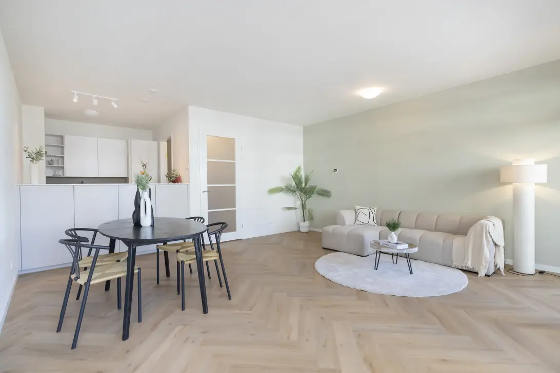 Na de oplevering in 2024 heeft onze opdrachtgever het appartement onder architectuur opnieuw ingedeeld en verder afgebouwd. De wanden en plafonds laten stucen, zeer mooie en complete Bruynzeel keuken laten installeren, Badkamer met ruime inloopdouche en keurig wastafelmeubel en op de vloer een hoogwaardige PVC visgraadvloer met ondervloer laten leggen.