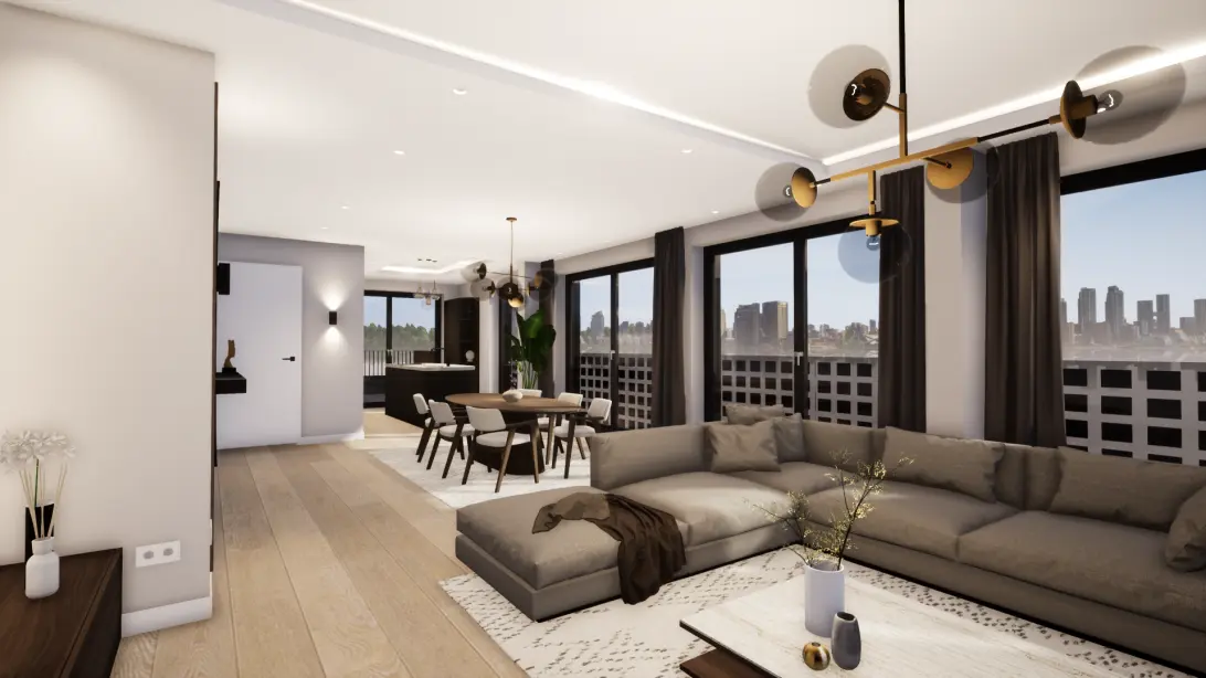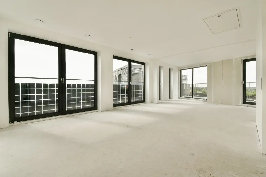 De woonkamer is licht, open en uitnodigend. De grote raampartijen zorgen voor een schitterende inval van daglicht en bieden jou de vrijheid om de ruimte in te richten zoals jij dat wilt. Of je nu houdt van strak modern, warm en huiselijk of een luxe hotelstijl: dit penthouse vormt de ideale basis.