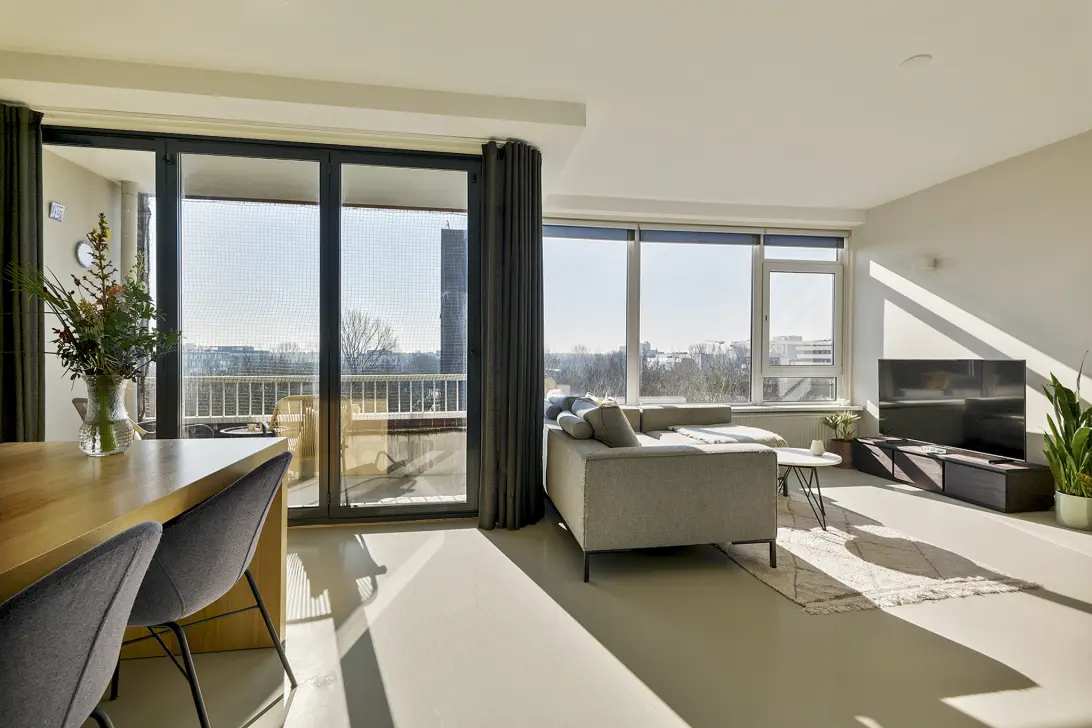 De royale living met open keuken beschikt over grote raampartijen wat uiteraard goede lichtinval geeft. Tevens geniet men hier van vrij uitzicht over groen en een deel van de stad. De living biedt met de harmonica pui toegang tot het balkon gelegen op het zuiden. Grenzend aan de keuken is aan een kleine muur op een speelse wijze een eettafel gerealiseerd. Aan de andere zijde van deze muur is het brede fornuis geplaatst.