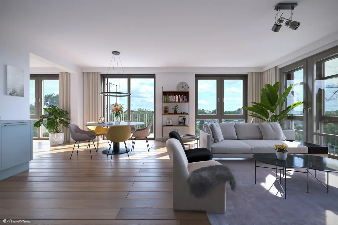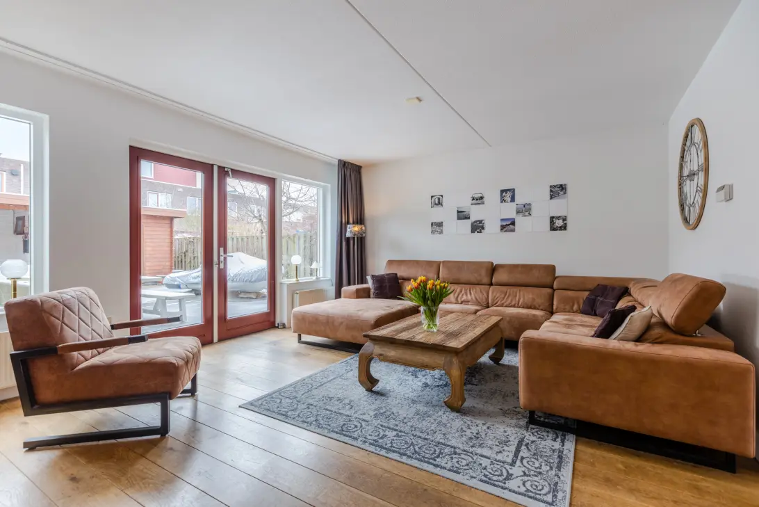 De royale woonkamer is voorzien van een houten vloer en strakke wanden. De grote raampartijen en openslaande tuindeuren zorgen voor een aangename lichtinval.