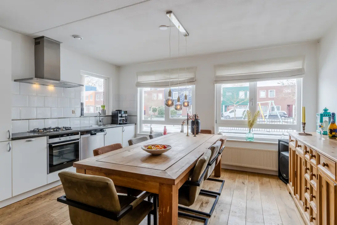 De keuken staat aan de voorzijde van de woning en is uitgevoerd in een rechte opstelling. Het design is strak met witte kastjes en een zwart werkblad. De keuken is de afgelopen jaren opgeknapt met nieuwe apparatuur. Je beschikt hier over de volgende apparatuur: vaatwasser, gasfornuis, afzuigkap, oven en koel-/vriescombinatie.