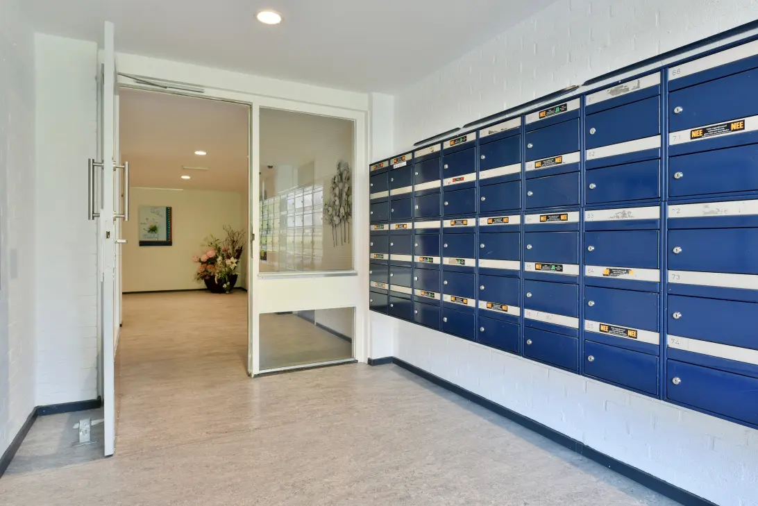 De centrale entree heeft een bellenbord en de Videofoon-installatie wordt op korte termijn vervangen door de VVE. In de onderbouw van het complex bevinden zich ook de individuele bergingen.