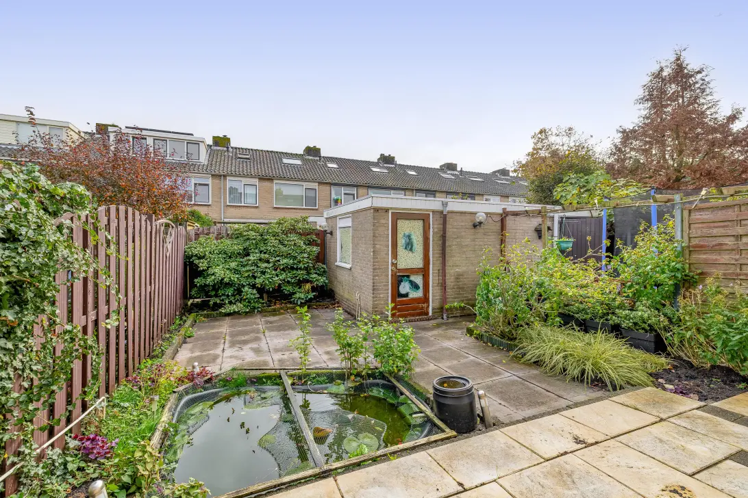 Vanuit de keuken loop je, met een hapje en een drankje in je hand, zo de tuin in. De ligging op het zuidoosten zorgt ervoor dat je volop van de zon kunt genieten. Liever schaduw? Aan de gevel hangt een breed, elektrisch bedienbaar zonnescherm. Je ziet niet alleen bestrating, maar ook lekker veel groen en een kleine vijver. In de berging kunnen de (kinder)fietsen en andere spullen staan. En de poort? Die geeft toegang tot de steeg.
