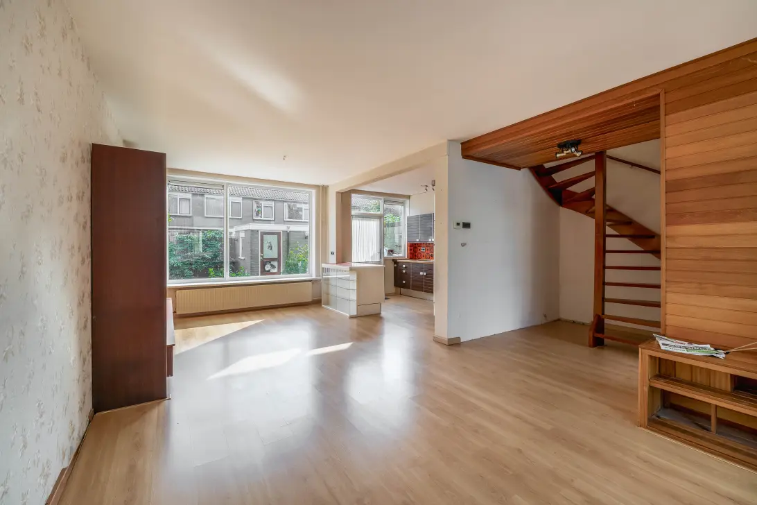 In de woonkamer, die een opvallende T-vorm heeft, is de hardhouten trap naar de eerste verdieping. Wil je de trap niet zien vanuit de woonkamer, dan is het mogelijk om de hal te vergroten of een trapportaal te maken. Het merendeel van de woonkamer is leeg, maar het zitgedeelte was aan de voorzijde en het eetgedeelte aan de achterzijde. Vlak naast de wandkast, die blijft staan, hangt een airco-unit die kan koelen en verwarmen.