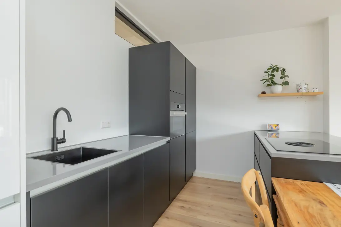 De lichte woonkamer is een fijne plek om te ontspannen, met grote ramen die zorgen voor veel natuurlijk lichtinval en een gezellige sfeer. De moderne open keuken sluit hier naadloos op aan en is voorzien van diverse inbouwapparatuur en voldoende kastruimte.