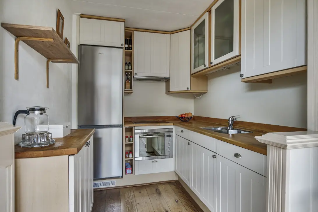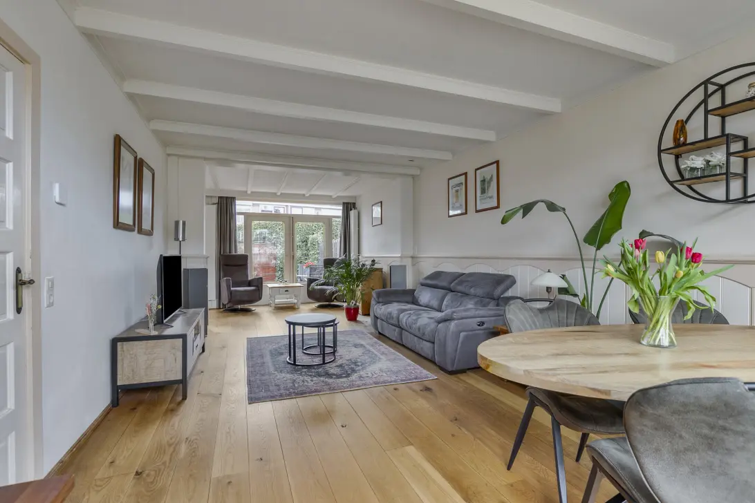Op de begane grond kom je binnen in een ruime hal, waarna je doorloopt naar de lichte, uitgebouwde woonkamer. Dankzij de sfeervolle openslaande deuren aan de achterzijde geniet je hier van veel natuurlijk licht en een directe verbinding met de tuin. De massief houten vloer draagt bij aan de warme uitstraling van deze fijne leefruimte.