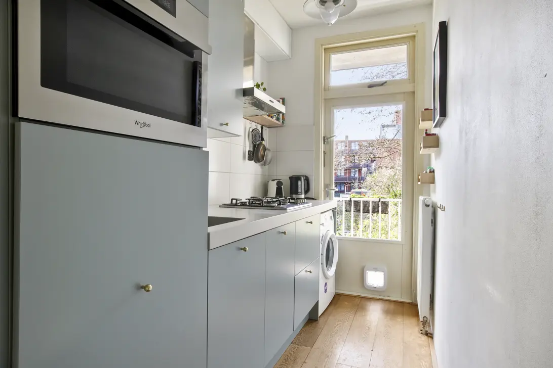 Aan de achterzijde liggen twee slaapkamers met de keuken in het midden. De moderne keuken is in circa 2019 geplaatst en beschikt over diverse inbouwapparatuur zoals een vaatwasser, koelkast, combi magnetron, gascomfort, vriezer en aansluiting voor de wasmachine. De fraaie badkamer uit circa 2020 heeft een inloopdouche, wastafelmeubel en toilet. Vanuit de keuken en de beide slaapkamers met openslaande deuren is toegang tot het heerlijke, zonnige balkon gelegen op het westen. Het balkon beslaat de volledige breedte van het huis.