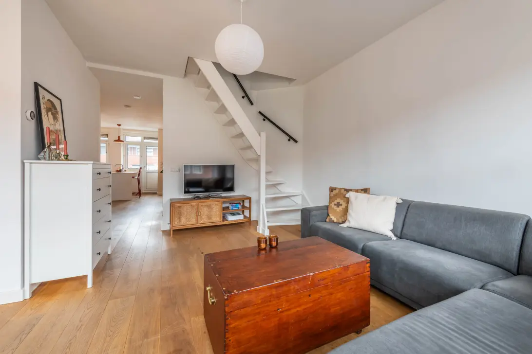 De L-vormige woonkamer is gelegen aan de voorzijde van de woning en heeft een plafondhoogte van circa 2,70 meter. Dankzij de brede raampartij valt hier veel natuurlijk licht binnen. De ruimte biedt voldoende plek voor een comfortabele zithoek.
