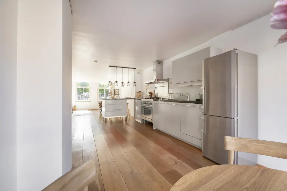 De woning is voorzien van een houten vloer en moderne keukenapparatuur.