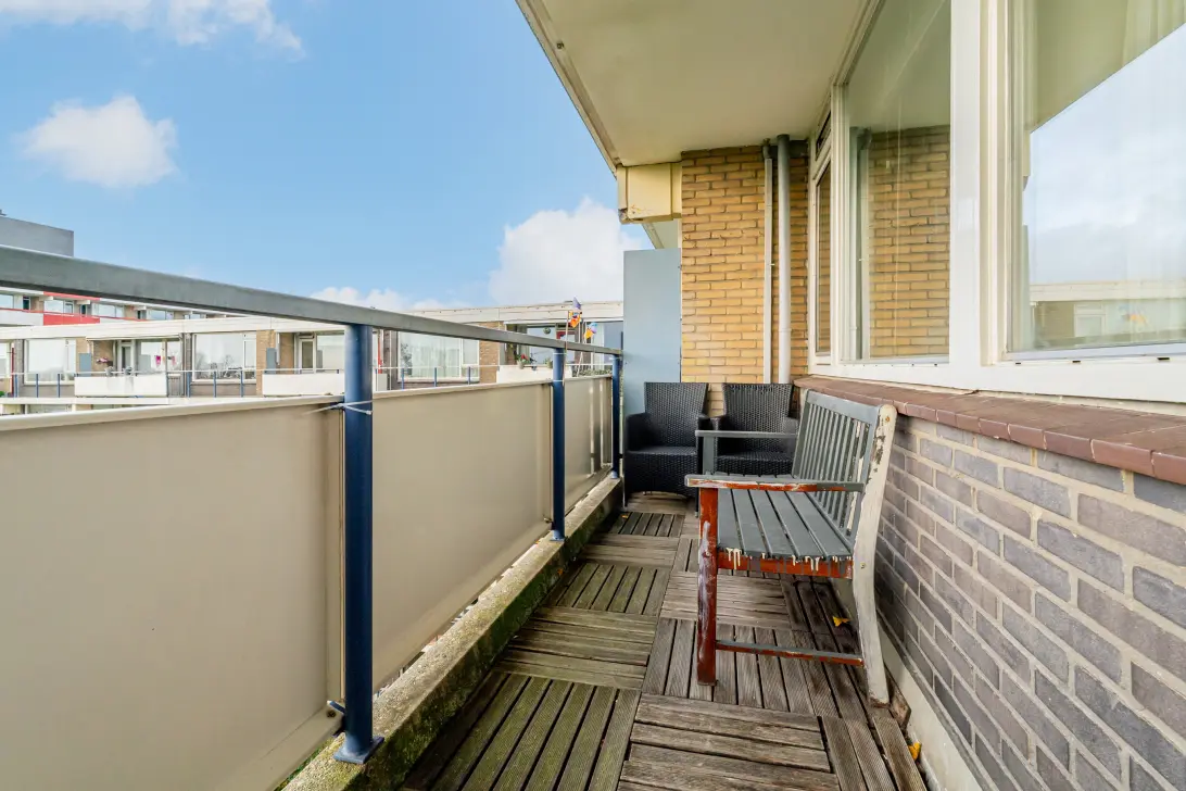 Het balkon is bereikbaar vanuit de zijkamer en ligt op het zuidwesten, waardoor je hier in de namiddag en avond volop zon hebt. Een fijne plek om na een lange dag even neer te ploffen, uit te kijken over de omgeving en gewoon lekker te ontspannen.