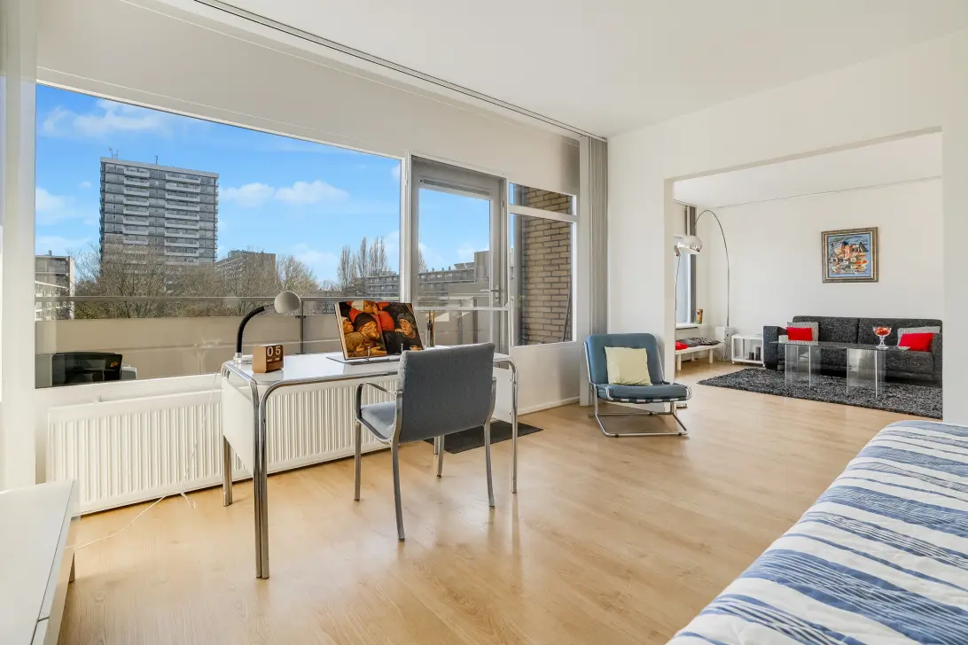 Het brede balkon is toegankelijk vanuit zowel de woonkamer als de werkkamer. Door het formaat en de ligging biedt het ruimte voor een zitje of beplanting en heeft het een rustig, vrij uitzicht.