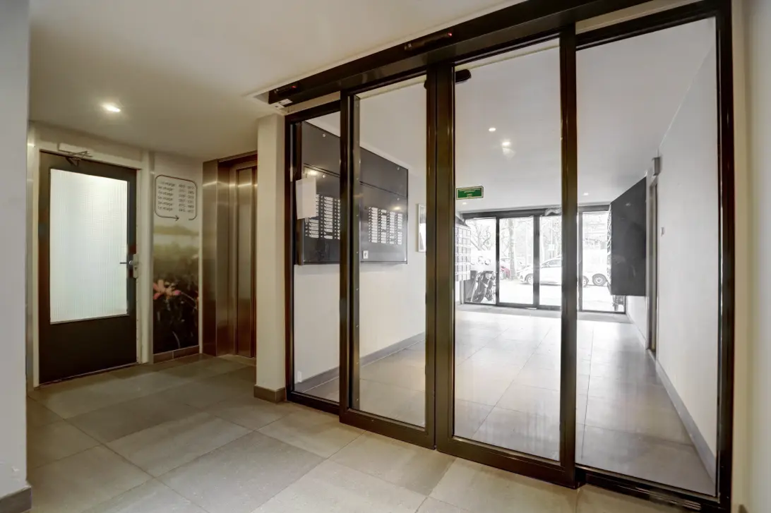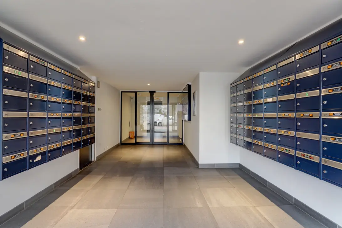 The apartment is accessed via a secured central entrance with intercom and elevator. The communal hallways and apartment front doors have recently been freshly painted, giving the building a neat and well-maintained appearance.