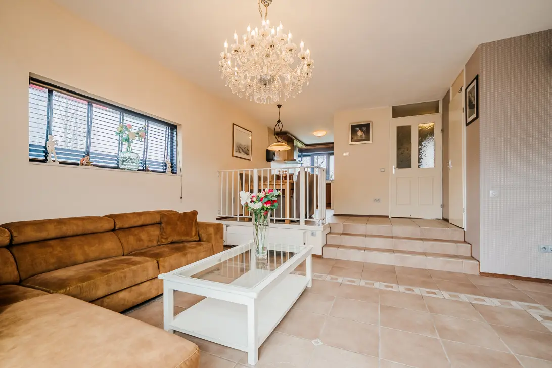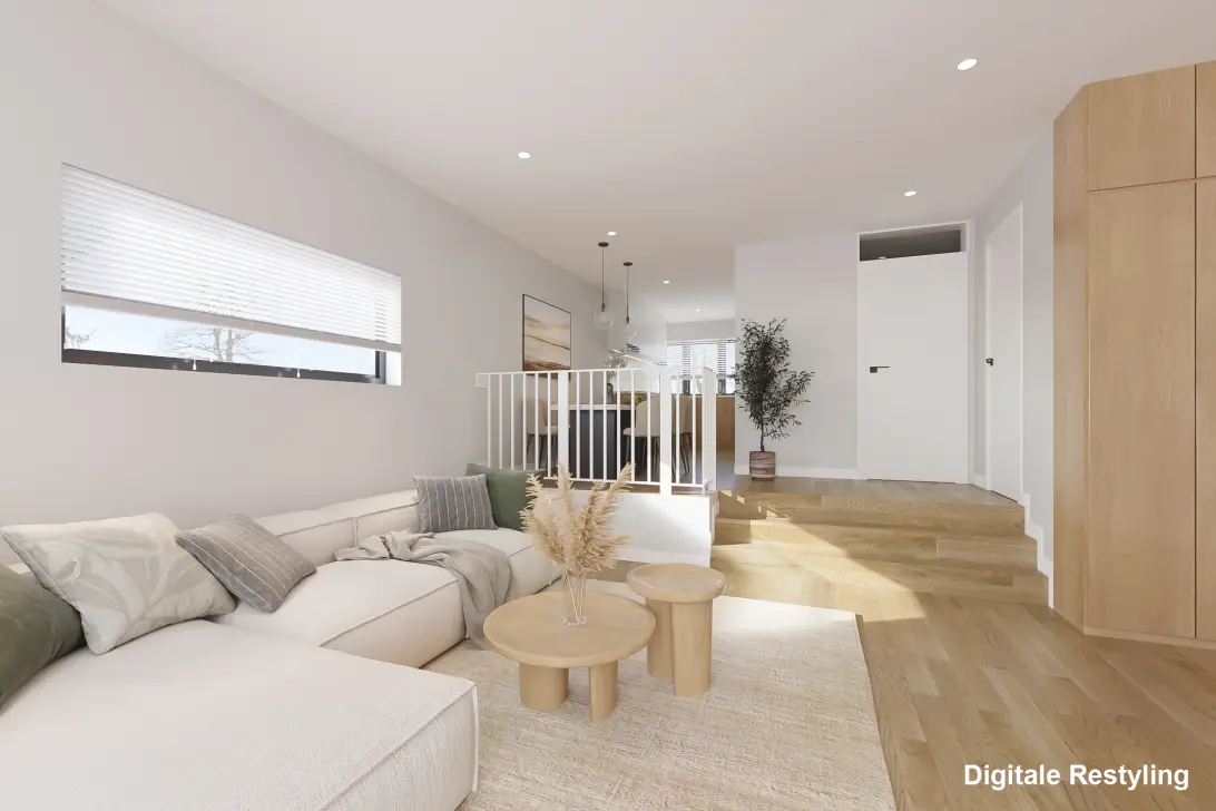 De unieke split-level indeling van de begane grond geeft deze hoekwoning een bijzonder karakter. De entree en keuken bevinden zich iets hoger dan de living en de aangrenzende tuin. Dit creëert een gezellige en sfeervolle uitstraling, terwijl de openheid en verbondenheid behouden blijven. Dankzij deze indeling profiteert de living van extra plafondhoogte en een overvloed aan natuurlijk licht vanaf de achtergevel. De begane grond is afgewerkt met een tegelvloer met vloerverwarming, en de muren en plafonds zijn strak afgewerkt.