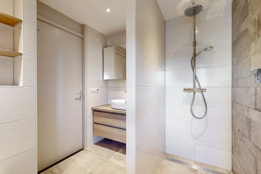 1e verdieping: ruime overloop met inbouwkasten, 3 slaapkamers waarvan 1 v.v. airco, moderne badkamer v.v. modern badkamermeubel en toilet.