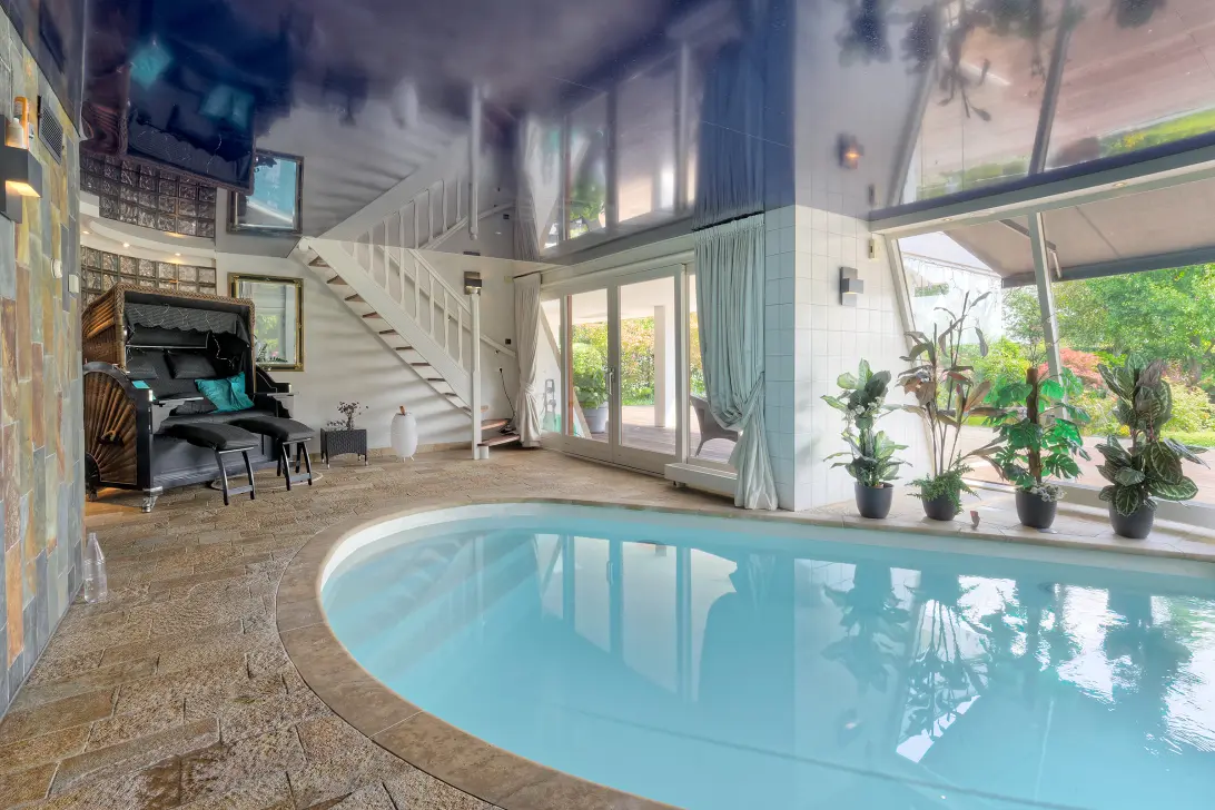 Ground floor: entrance hall with wardrobe and meter cupboard. The spacious garden-facing living room with fireplace has double sliding doors and provides access to the veranda and the beautifully landscaped backyard with a sun terrace, pond, and wooden garden shed. The additional space next to the living room is currently used as a reading nook and study. It would be easy to create two additional bedrooms here. The luxurious kitchen-diner is located at the front of the house and features a granite countertop with a double sink, a semi-circular cooking island with 5 induction cooktops, an American-style refrigerator/freezer, double oven, coffee machine, dishwasher, and ample cupboard space. Adjacent is a separate toilet and the hobby/laundry room with access to the upstairs storage loft with the central heating system. The beautiful pool room with shower facilities has a lovely pool and access to the garden. Here you can swim your daily laps or simply relax.