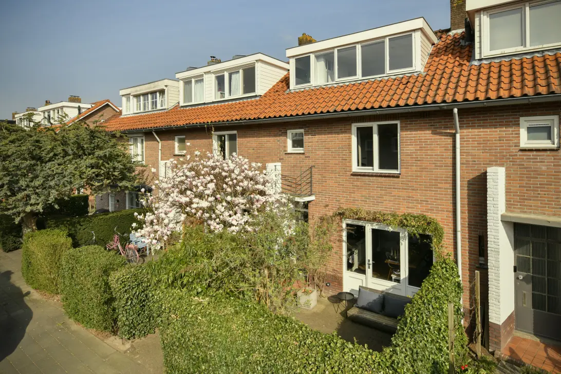 De woning is van oorsprong gebouwd in 1956 als tussenwoning in een rijtje van 4. Net als de omliggende woningen in dit mooie buurtje, wordt zij getypeerd door de opvallende toegang met de diagonaal geplaatste entree met luifel waarboven van oorsprong een balkon lag. De meeste woningen in deze buurt zijn ca. 100m², maar door de geplaatste uitbouw op de begane grond aan de achterzijde van deze woning én de gevel-brede dakkapellen aan weerzijde op de zolderverdieping, telt deze woning thans: 120m². Mogelijk is de woning middels een extra uitbouw op de eerste verdieping nog verder te vergroten. De woning is verdeeld over 3 woonlagen. Er is een beschutte en goed bemeten zonnige voortuin, die je op zomer-namiddagen met de woonkeuken in verbinding stelt, door de openslaande deur in de voorgevel. De achtertuin (met achterom) is ondanks de uitbouw, nog steeds erg ruim en héérlijk zonnig en biedt plaats aan meerdere zitjes en fraaie borders. Achterin de tuin is een riante stenen schuur van nog eens 8m², waar fietsen, kussens en gereedschap plek krijgen.