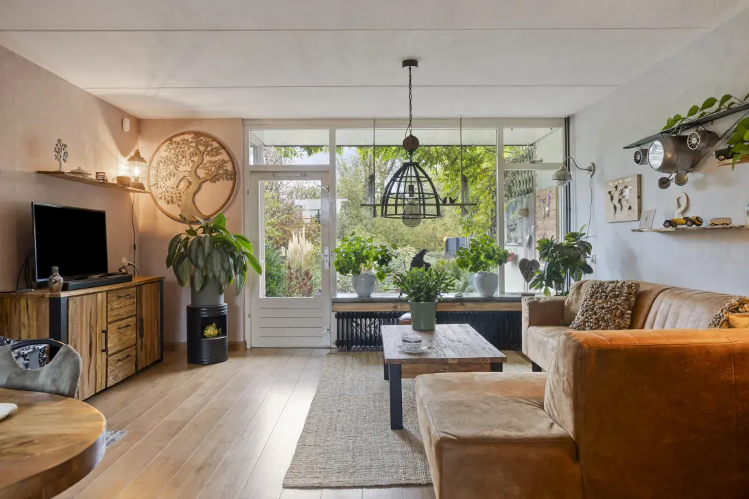 Entree met lichte hal. Hier bevindt zich de meterkast en vanuit de hal heb je toegang tot zowel de woonkamer, het toilet en de inpandige berging. De woonkamer is tuingericht en voorzien van sfeervolle open haard. Dankzij de vele ramen is het een lichte woonkamer met directe toegang tot de keuken en tuin.
